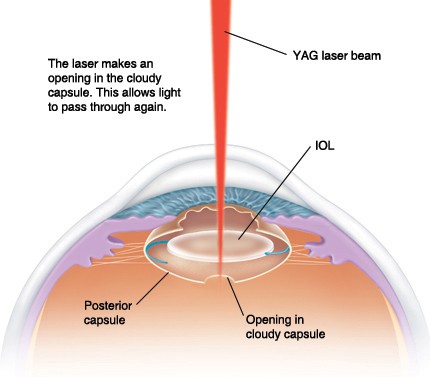 To treat this posterior capsule opacification, doctors use a type of laser called a Yag laser to make a hole in the back of the capsule to clear away the cloudines so that light may pass freely to the back of the eye.