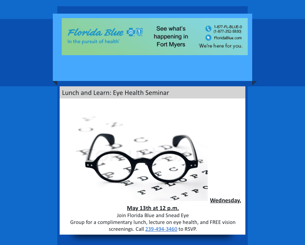 Join the Snead Eye Group Wednesday, May 13th 2015 at 12PM for free vision screenings and cataract screenings at the Florida Blue Lecture, sponsored by Florida Blue Cross & Blue Shield.